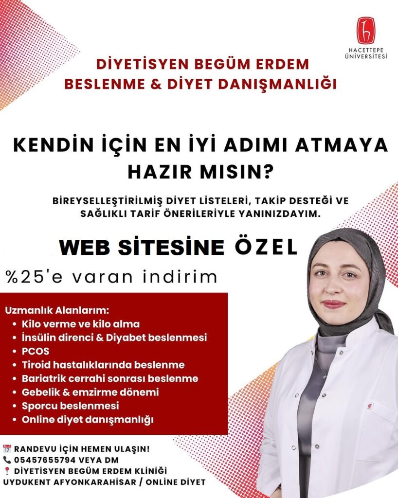 Dyt. Begüm Erdem, Afyonkarahisar merkezli deneyimli bir beslenme uzmanıdır. İletişim bilgilerinde Düşüm Pastanesi üstü, Selçuklu Mah., Adnan Kahveci Cad., Afyonkarahisar adresi yer almaktadır. hem online hem de yüz yüze danışmanlık hizmeti vermektedir. Instagram İrtibat için WhatsApp numarası